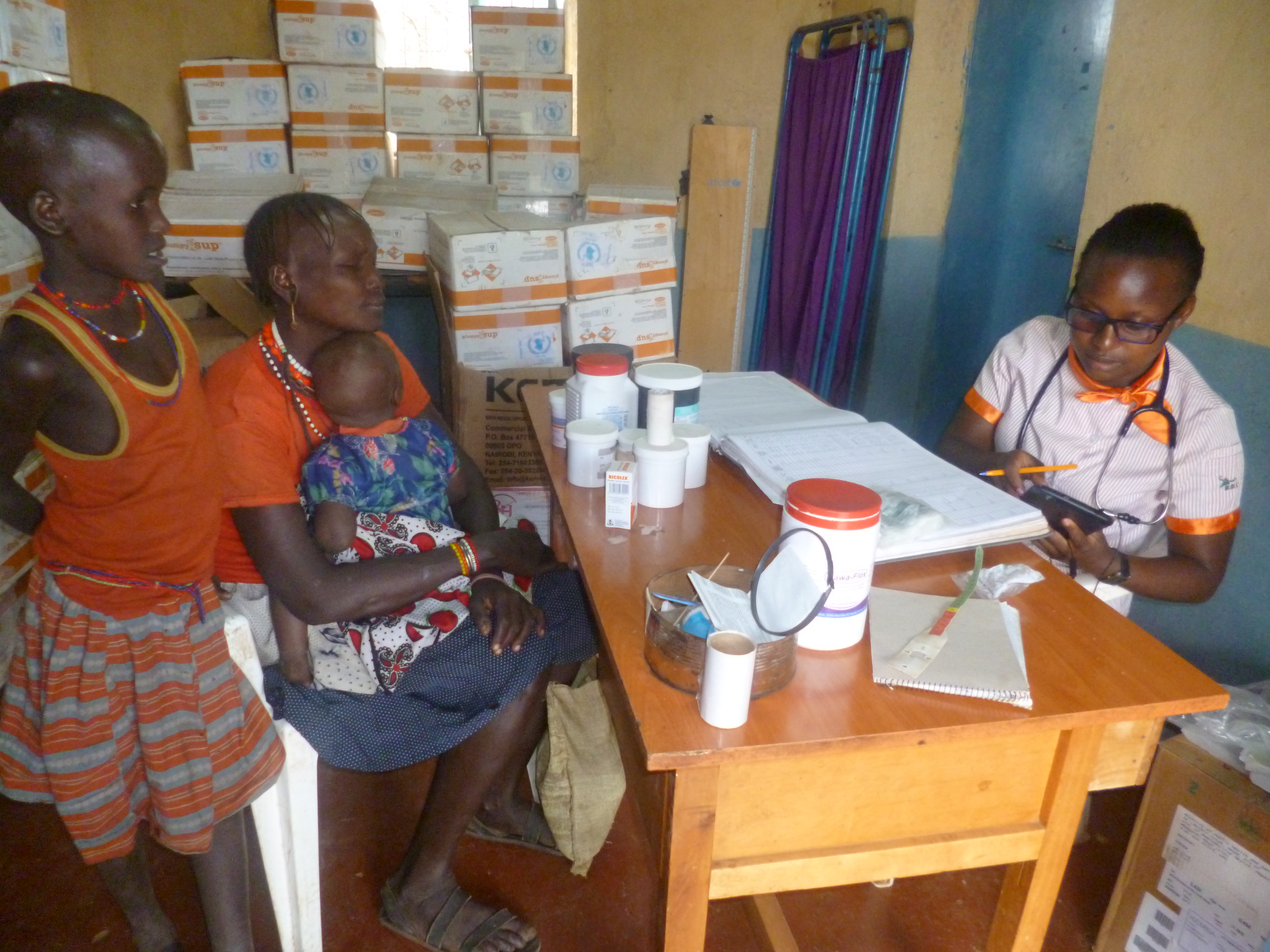 A scene at the Kamurio dispensary reflects of her busy days look like.Patients streaming in the small dispensary most women and children .Many of the women with braids that are black and shiny , dressed in round skirt and beads on their necks and wrists .One by one they enter consultation room and talk to Sylvia who attends to them keenly and scribbles, checks and gives medicine explaining in Pokot and when she needs more assistance Community Health Worker intervenes.One of the women has a one year old child whose symptoms are similar to Malaria.”My baby has fever at night and she has lost appetite, what can I do”Sylvia says that is malaria but with n drugs at the facility she will refer her to another hospital which is far away.