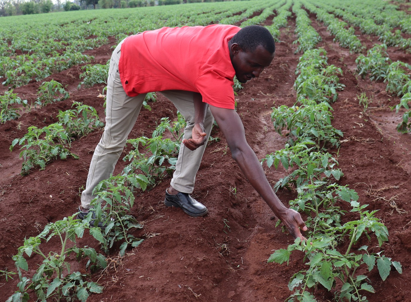 John Waweru inspects his tomatoes at his farm in Kang’aru in Kenya’s Kirinyaga County/ Dominic Kirui.