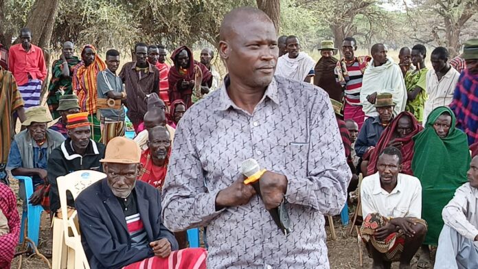 Erupe Lobuin addressing a peace meeting at Isiolo/Igembe border/ Cosmas Ekuwam.