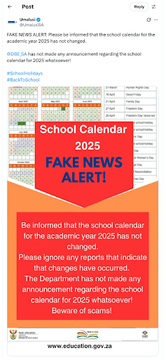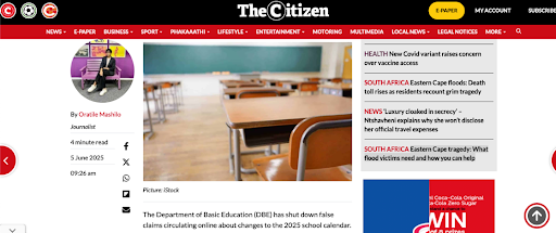 The Citizen newspaper published on 5 June 2025, that the Department of Basic Education (DBE) has shut down false claims circulating online about changes to the 2025 school calendar. They were dismissing false claims that Priya also wrote on RiseUp that “2025 South Africa School Holidays Changed – Education Dept Releases New Dates & Term Breaks.”