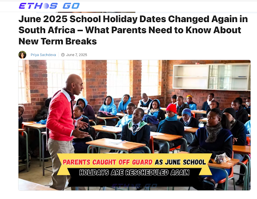 On 7 June 2025, Priya Sachdeva wrote on ethosgo.co.za, “June 2025 School Holiday Dates Changed Again in South Africa – What Parents Need to Know About New Term Breaks”.
