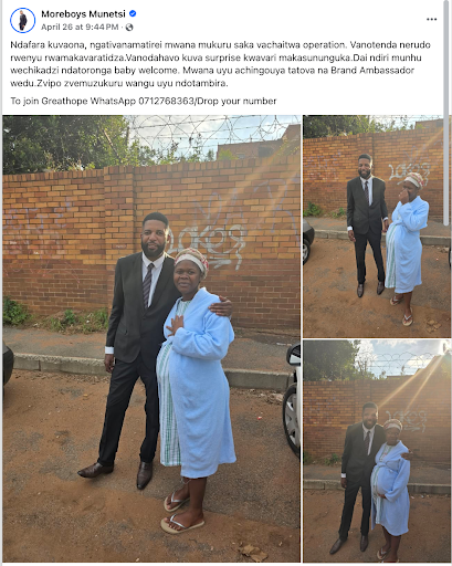 Through his Facebook post, the Founder of Great Hope Insurance, Moreboys Munetsi, reached out to his followers to help locate the pregnant woman, Melissa Munamati. He said “Ndokumbirawo kuti pane anokwanisa kuwana ma contact emudzimai uyu. Zvirikuita kunge vashandi vepachipatara. Chikumbiro changu ngatizamei kumubatsira as soon as possible.