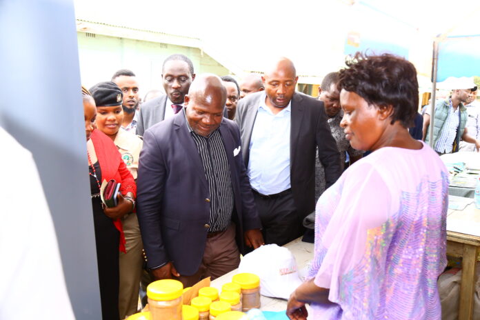 Kakamega County Governor, FCPA, Fernandes Barasa (Centre), His Deputy, Hon. Ayub Savula (left) at a farmers’ stand during the exhibition of the Second Governors’ Day with Farmers.