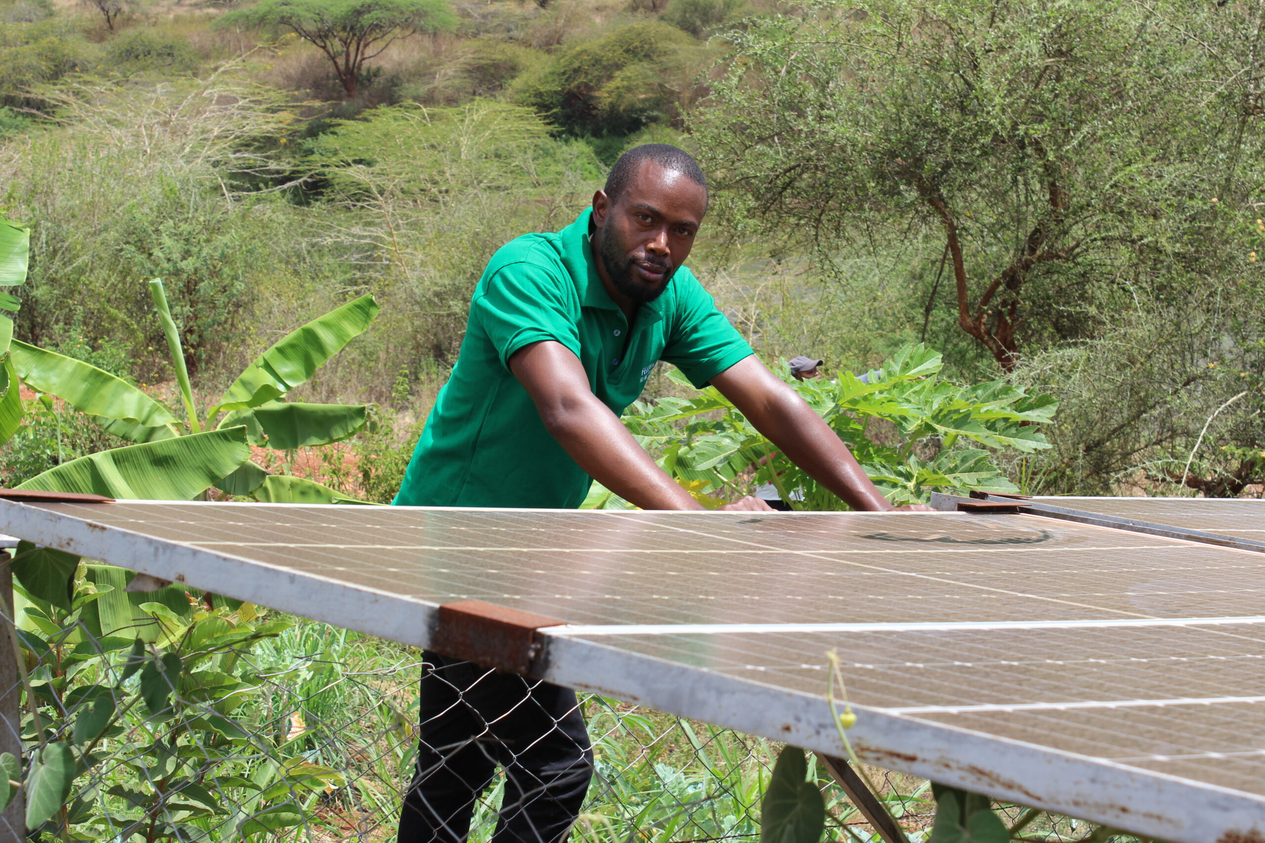Thiong’o Gachie a regenerative agriculture trainer at the farm showcasing the solar panels they use that pump water from the borehole/Lenah Bosibori.
