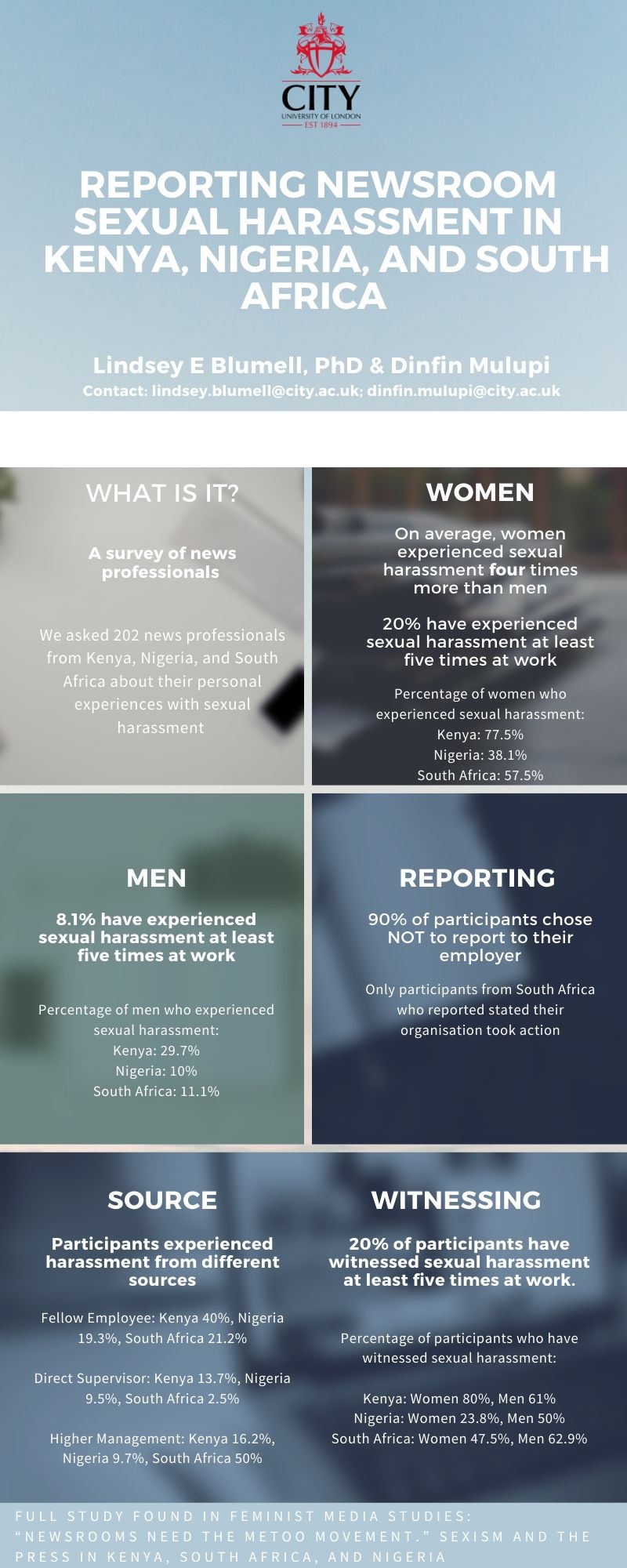 “It is evident from this study that sexual harassment is rampant in the media industry in the three countries. While both male and female survey participants reported experiencing sexual harassment in the workplace, on average, women experienced sexual harassment four times more than men,” said Dr. Lindsey Blumell, the lead researcher, and a senior lecturer at City, University of London.