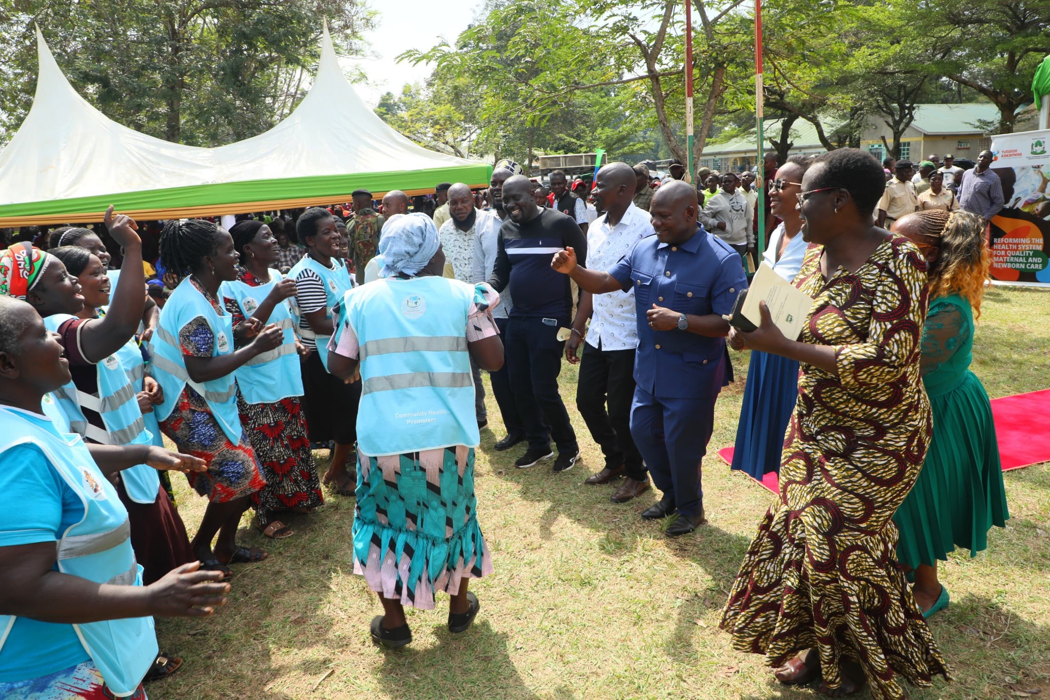 Kakamega Governor Fernandes Barasa (in blue Kaunta Suit) dances with CHPs at Matungu during the launch of a modern maternity wing. Photo/Shaban Makokha