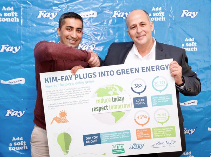 Kim Fay joins the growing number of green factories in Kenya seeking to increase operational efficiency while reducing their electric-power carbon footprint.  The manufacturers’ Clean Energy Initiative has seen the installation of 382 Solar panels on its factory roof.