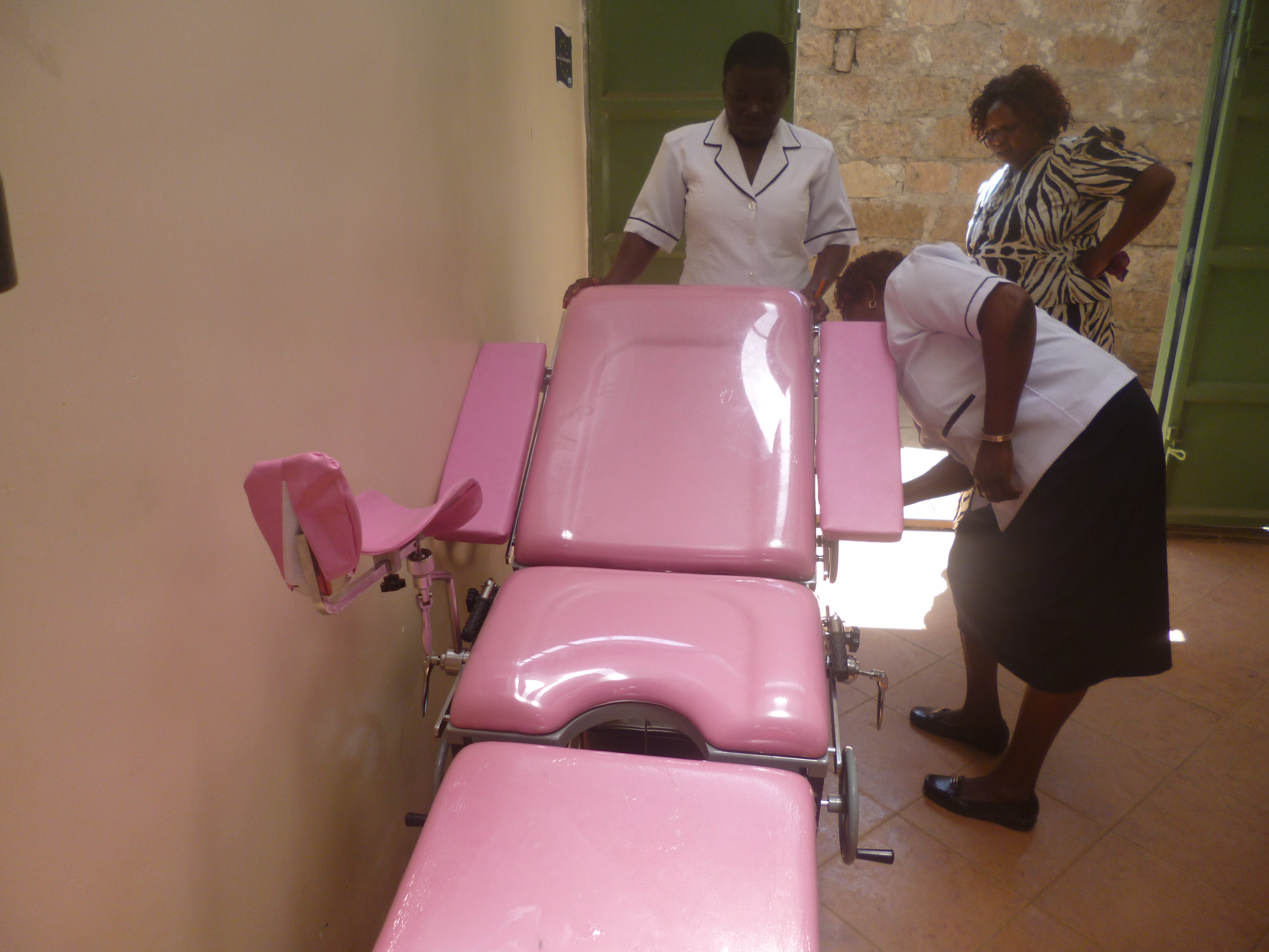 Nurses at Korogocho Health Centre trying to adjusting a delivery bed designed for women living with disability .