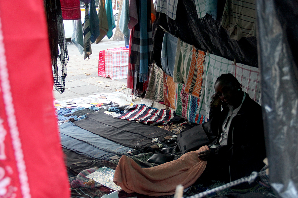Sibongile Ndlovu, an asylum seeker from Binga, Zimbabwe inside her makeshift stall at Joubert Park.