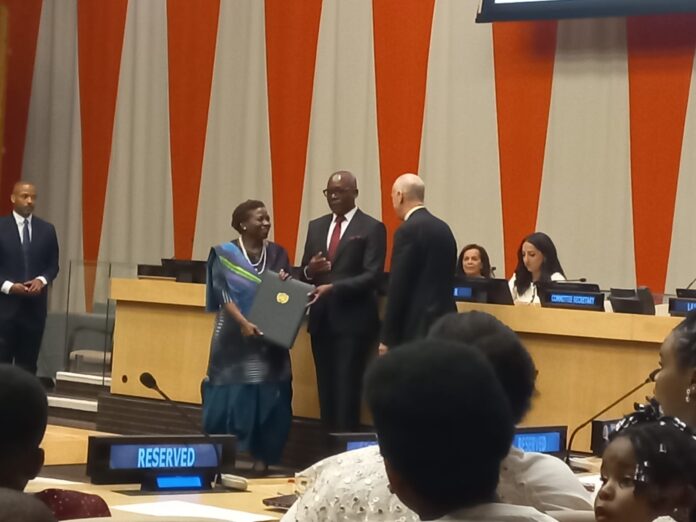 Dr. Eliya Zulu( Middle) receives the UN population Award, Institutional category from the UNFPA Executive Director, Dr. Natalie Kanem in New York last night/ Courtesy photo.