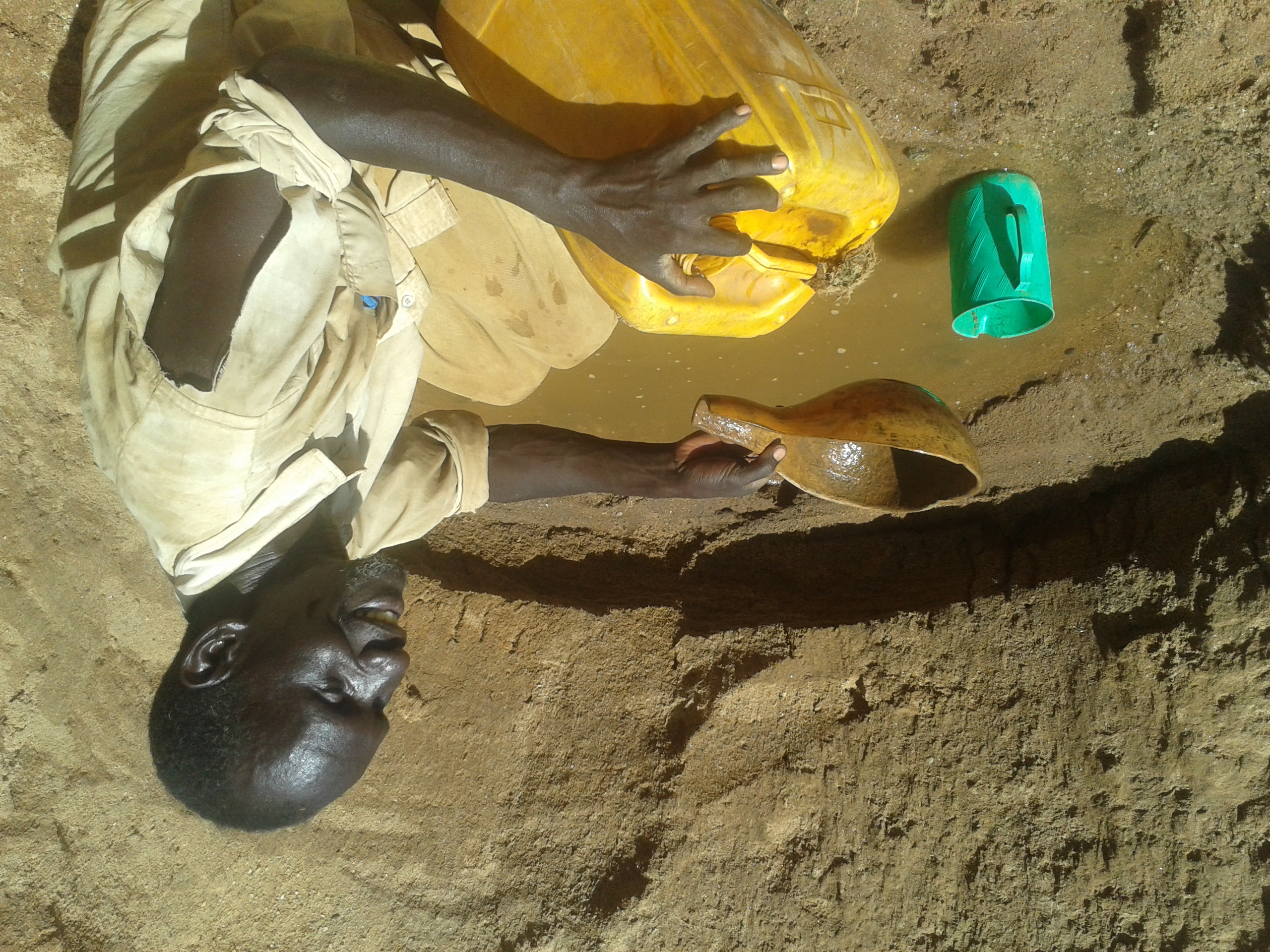 In groups of between five and seven, some people are digging the sand to get water while others are in already dug shallow wells scooping water with calabash carefully.