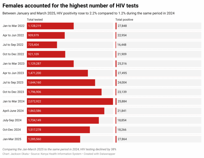 Data from the Ministry of Health shows a troubling drop in HIV testing and prevention uptake. Between January and March 2025, HIV testing declined by 38%, with only 1.28 million people tested compared to 2.07 million in the same period in 2024.