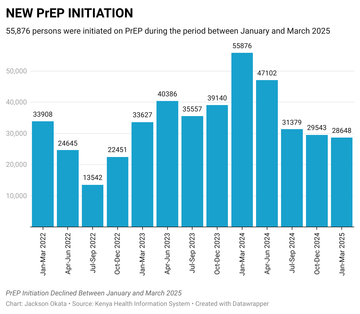 More worrying is the decline in the uptake of Pre-Exposure Prophylaxis (PrEP) by 49%. During the period, 28,648 people were initiated on PrEP, down from 55,876 during the same period in 2024.